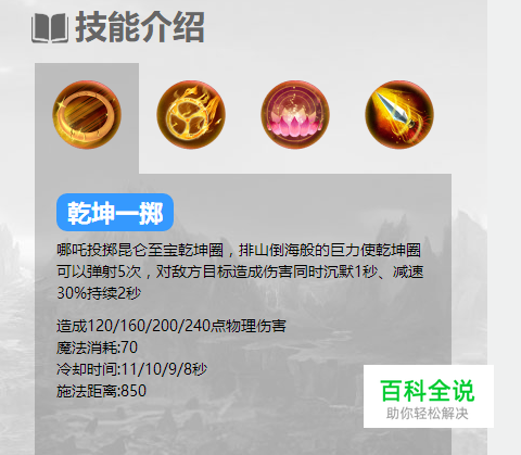 乾坤一掷技能,朝敌人丢出一个乾坤圈,可以在敌人之间连续弹射,并对敌人造成沉默效果,非常强大的一个技能,经常一些法师英雄被沉默后哪吒只要普攻几下生命值就没有了。