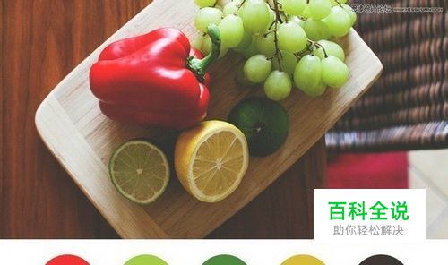 选择色彩方案 因背景色彩对比明显才能更好衬托出透明感,因此倾向于选择色调变化较大、分布较广的图片。 配色方案吸取的颜色为:柿子椒的正红、青檬皮的深绿、葡萄的浅绿和柠檬黄,另外选择图片中的暗色木桌面作为底色,底色发挥衬托其他色彩的作用,如果你的其他色块面积大基本上也看不到底色,但能感觉到它。(嘻嘻,是否能理解这种“看不见但能感觉到”的神秘感呢?) 有人也建议直接选用黑或白的底色,但是我认为图片本身对黑白的表现要丰富得多,纯黑或纯白则过于规则和保守。
