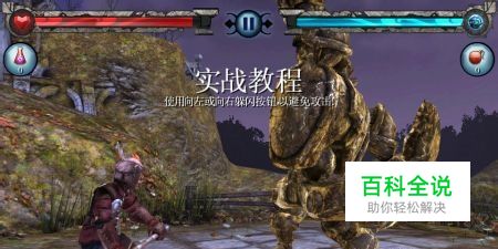 点击左或右可以躲闪它的攻击,左上的红色药瓶为治疗药,右侧的为炸弹可眩晕住敌人,滑动屏幕可以攻击。