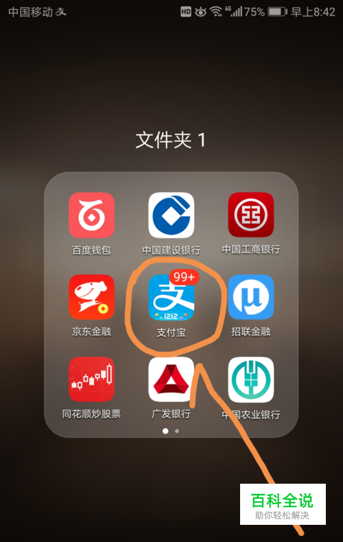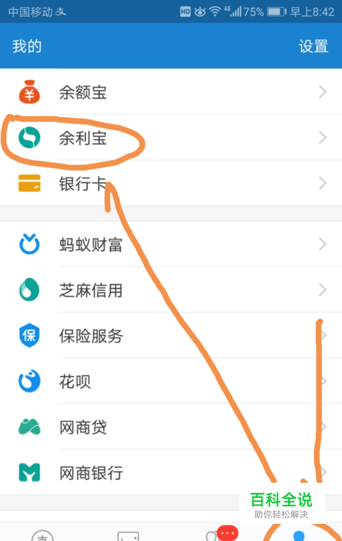 进入支付宝中点按界面下方的我,然后点按箭头指向的余利宝标志。