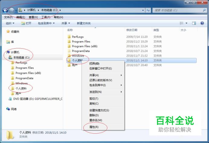 如鼠标右击"计算机→本地磁盘(C:)→个人资料"文件夹,弹出快捷菜单选择"属性"项。