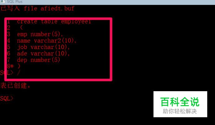 首先用户必须要有CREATE TABLE系统权限,并且只能在自己的模式中创建表,图中的例子使用CREATE TABLE语句在当前模式中创建了一个共有5列的表:表的名称为employee1,包含 emp, name, job,age,dep 等5列,后面的number、 varchar2、等为数据类型,括号里面为长度