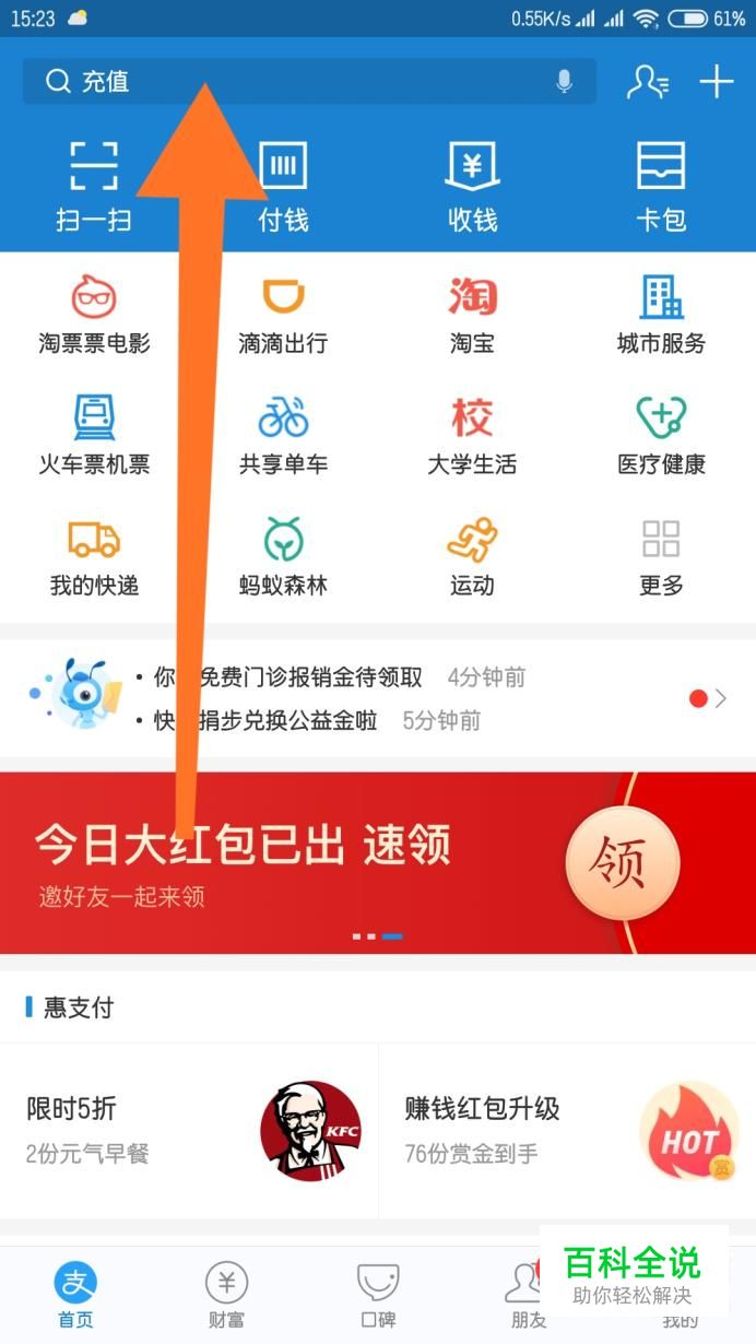 首先打开我们的支付宝APP,点击上方的搜索框,键入“商家服务”搜索。