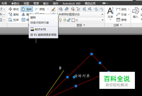 根据提示输入旋转角度或参考对象旋转,可以选择输入指定旋转角度或进一步指定参考角度。直接输入角度简单,不细说,只要注意正数为逆时针旋转,度分秒转化为度的小数位或按照##d##'##"输入。 本例主要介绍指定参考角度,也就是输入r,回车。