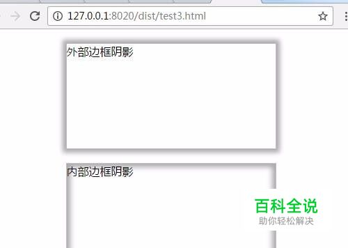 所有代码。可以直接复制所有代码到新建的html文件上,粘贴保存后使用浏览器打开即可看到效果。 所有代码: <!DOCTYPE html> <html> <head> <meta charset="UTF-8"> <title></title> <style type="text/css"> .out,.in{ width:300px; height: 150px; border:1px solid #BFBFBF; margin: 20px auto; } .out{ box-shadow:0px 0px 10px 5px #aaa; } .in{ box-shadow:0px 0px 10px 5px #aaa inset; } </style> </head> <body> <div class="out">外部边框阴影</div> <div class="in">内部边框阴影</div> </body> </html>