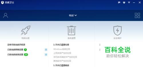打开百度卫士,我们看到上面有三个选项,分别是电脑加速、系统清理、安全维护。下面我们分别介绍一下。