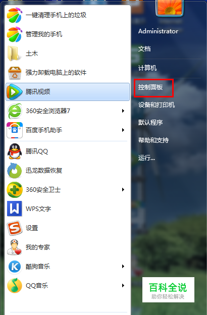 第一步跟方法一也是差不多的,也是点击开始,不过这个是要找到【控制面板】选项,如图所示