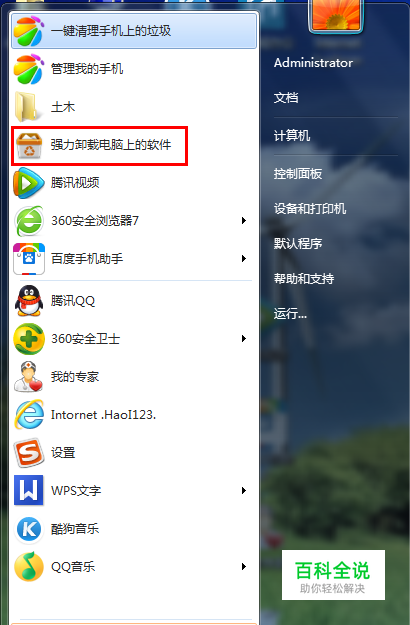 瑞星软件用360卫士一般的卸载是卸载不了的,打开电脑的【开始】那里,看到【强力卸载电脑上的软件】