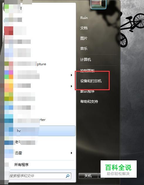 点击桌面的Win键,在开始菜单中找到设备和打印机。