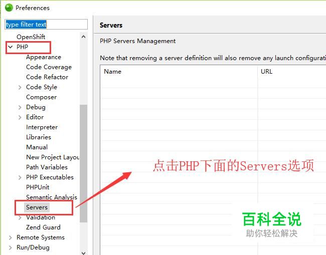 接下来在弹出的Preferences界面中我们展开PHP选项,选择里面的Servers选项,如下图所示