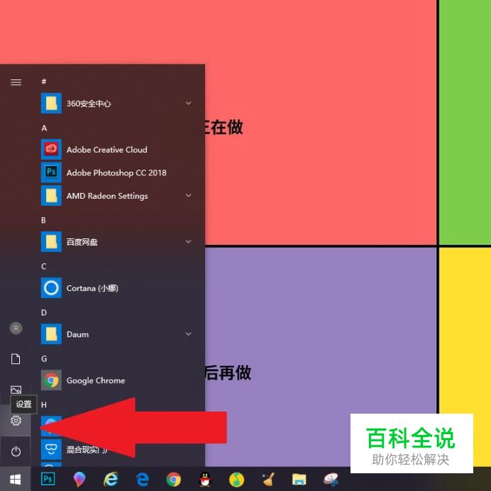 首先鼠标单击电脑桌面左下角的开始图标,然后点击锯齿状的设置图标。