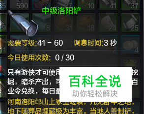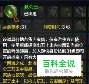 成为游侠身份以后,即可开始挖宝,首先需要在各杂货商处购买昆仑玉,用百业令在身份兑换商处兑换洛阳铲,也可在拍卖行购买,不同等级使用的洛阳铲也不同,分初级、中级、高级等。