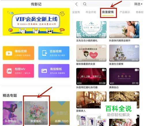 我们点开横版视频,可以看到【浪漫爱情】的分类,下方有非常多的浪漫的婚礼开场视频。我们选择一个适合我们的视频,就可以开始制作啦。或者直接选择首页的【浪漫婚礼】的专题,里面也都是婚礼类视频。