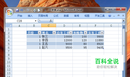 在 Excel 里准备好员工工资表。 在如图的表中,包括了“月份”、“姓名”、“应发工资”、“扣除数”、“实发工资”几个字段,这些字段稍后将被合并到 Word 里的工资条版式之中。