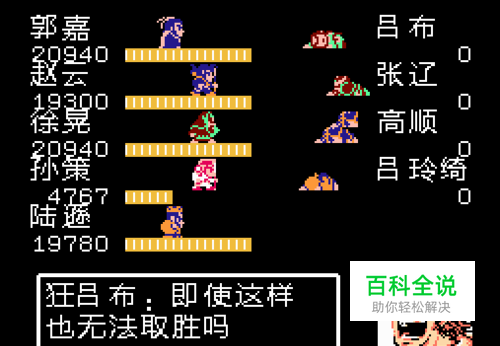 对话之后进入下图1中的下邳城与站在城外的吕布对话,吕布生气发狂,发狂,发狂,重要的事情说三遍,吕布能秒人,打一回合用一s/l,保持狂吕布在离间状态。 27级神机阵(郭嘉S/L离间狂吕布,物理和陆逊落石集火吕玲绮,之后S/L疑心张辽,集火高顺) 胜利之后触发三擒三纵剧情。吕布回家,去吕布家和他对话,对话完之后再与吕布对话,吕布便会加入(如果再对话吕布问将军岂可无马,说明你的赤兔马装备上了,请取消装备,出门后再进门对话后,狂吕布加入)