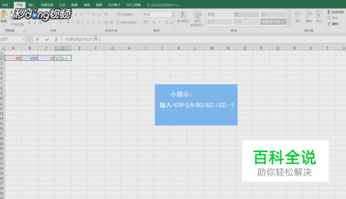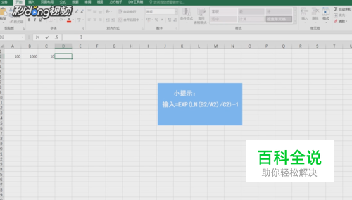 选择“D2”单元格并在编辑栏中输入“=EXP(LN(B2/A2)/C2)-1”,然后点击回车键。