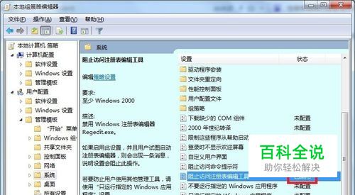 用户配置→管理模板→系统→在右边窗口找到:阻止访问注册表编辑工具→并双击打开该策略。