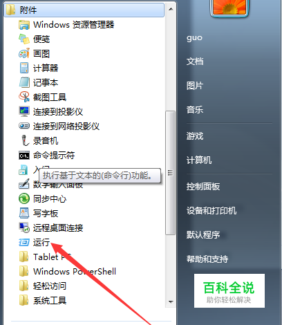 打开开始菜单,点击运行。找不到运行,可以使用键盘快捷键打开,win+r打开即可。