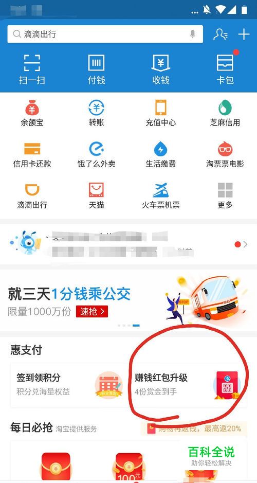 首先打开手机支付宝,在首页上你会看到赚钱红包升级,点击进去。