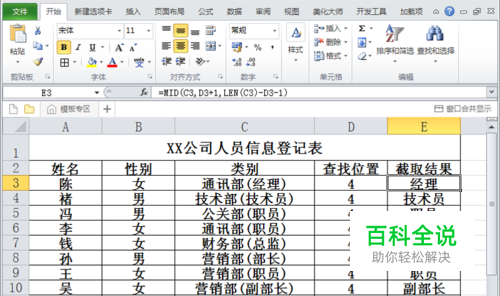 在单元格e3中输入公式=MID(C3,D3+1,LEN(C3)-D3-1),按回车键确定,结果就出现了。
