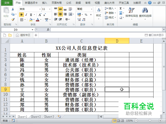 首先启动excel2010,打开一份“XX公司人员登记表”,在单元格d2中输入“查找位置”,在单元格e2中输入“截取结果”。