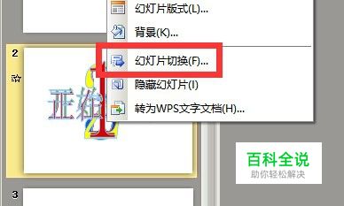 进入幻灯片切换 找到Powerpoint文件后,对一个演示文稿页面进行右击操作,在弹出来的右键菜单中选择“幻灯片切换”菜单,来打开“幻灯片切换”选项卡。在“幻灯片切换”选项卡中可以找到所有关于幻灯片切换的内容。