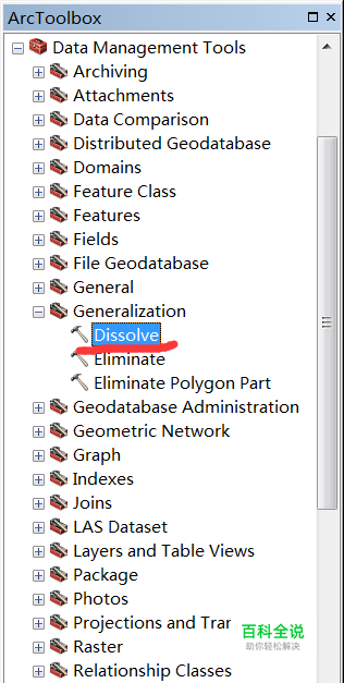 把要合并的图层加载至ArcMap中,打开工具箱,Data Managenment Tools-->Generalization-->Dissolve工具