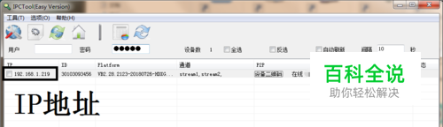 打开IPCTool搜索工具,可以搜到摄像头的IP地址,并记住设备的网段。(如图所示,假如设备的IP地址:192.168.1.219,其中这个 1就是这组IP地址的网段。)