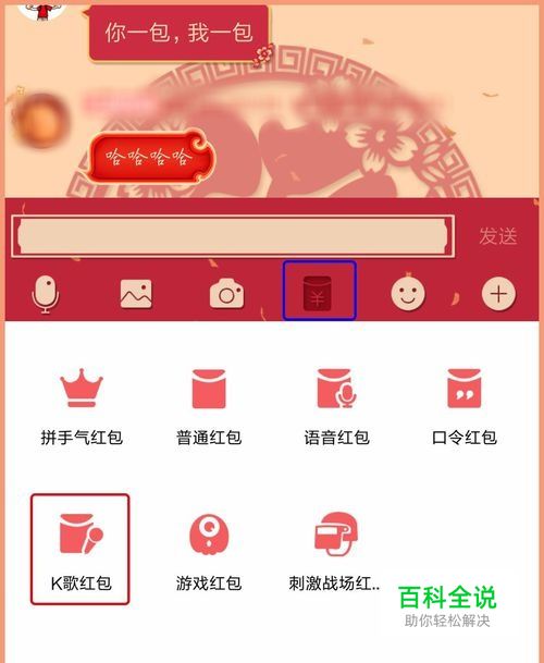 【K歌红包】 这个可以发给单人也可以在群里发, 先点开如图红包按钮,选择并打开“K歌红包”。