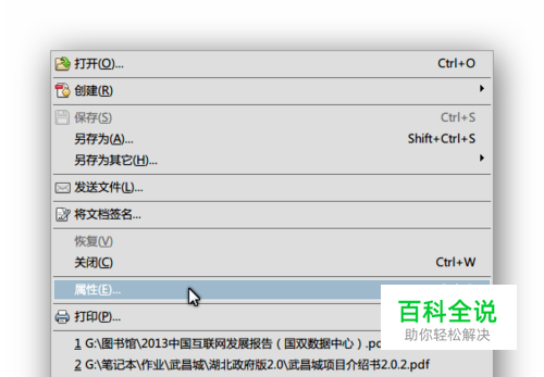 打开需要添加密码的PDF文档,选择文件>属性,弹出设置对话框。