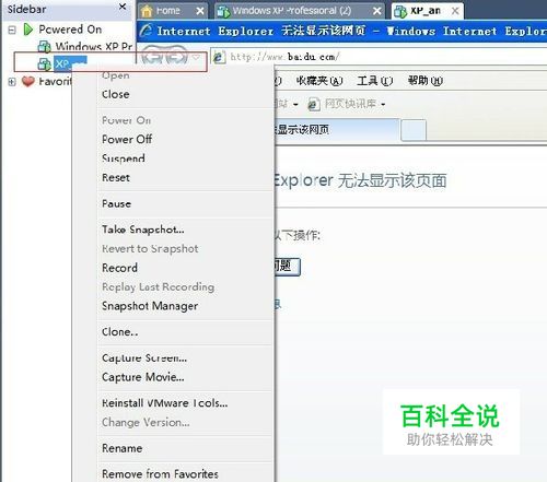 在VMware界面上选择操作系统的名称如:XP,点击鼠标右键,选择最下方的setings,如下图