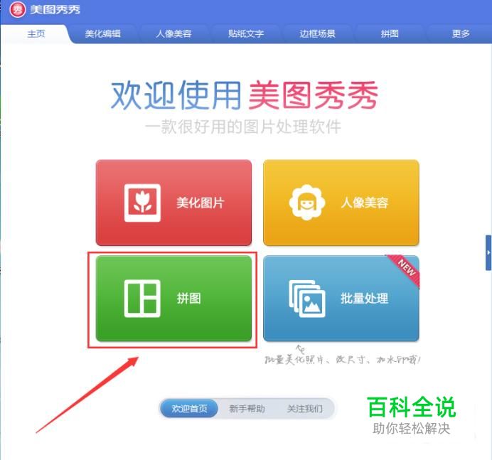 打开美图秀秀软件,点击拼图的字样打开,如图所示。