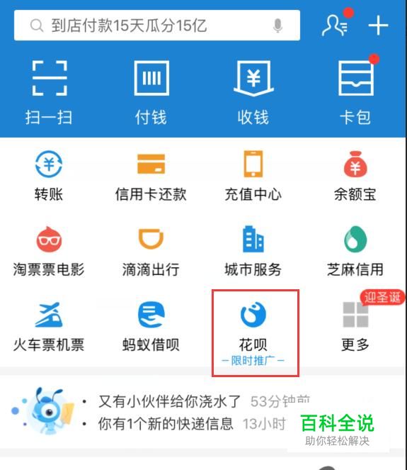 在手机桌面打开支付宝,进入支付宝首页找到并点击“花呗”。