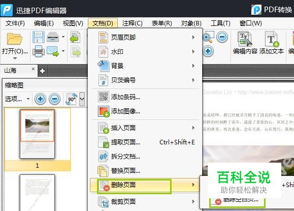 在“文档”功能下单击“删除页面”,可选择删除页面还是空白页,或者在左侧页面缩略图中选中页面,一键“Delete”删除页面。