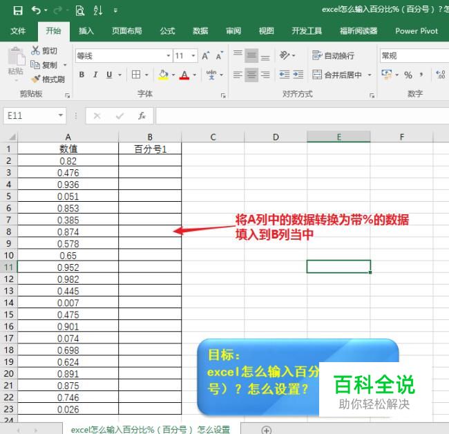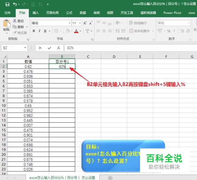 最简单的方法是手工输入,B2单元格先输入82再按键盘shift+5键输入%