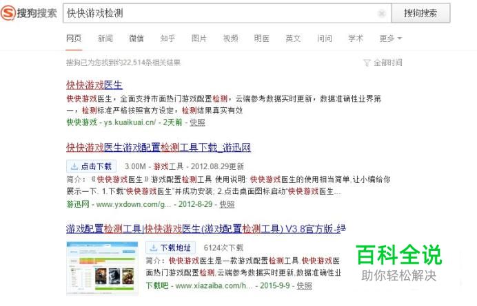 打开搜狗搜索,输入关键字快快游戏检测,并查看结果。