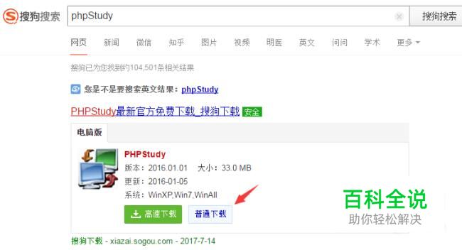 phpStudy的下载:在搜狗搜索的输入框内搜索“phpstudy”,出现的第一条便是官网下载地址。点击箭头所指的“立即下载”,即开始下载phpstudy。