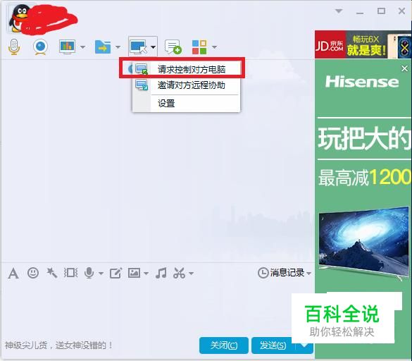 QQ远程,在工具栏中选择一个电脑图标,选择下拉出的“请求控制对方电脑”,对方接受你的请求后,便可以控制操作对方的电脑了; 注:需要双方都装了QQ,并且要获得对方同意