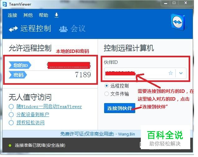 TeamViewer 打开TeanViewer,在右侧“连接控制伙伴电脑”下方的“伙伴的ID”输入伙伴的ID,点击“连接到伙伴”,之后输入密码并确定后便可以连接到被控制的电脑上 注:这种方法的前提是对方的电脑也开着TeamViewer,并且知道对方的ID和密码,需要网络畅通
