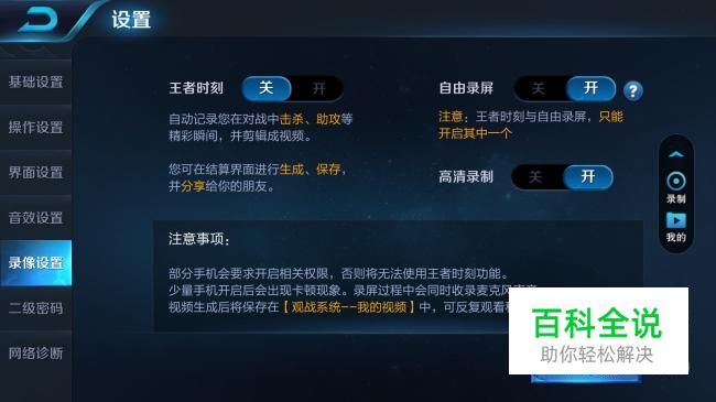 在录像设置界面中有王者时刻、自由录屏,和高清录制。,开启之后随时可以开始或者停止或者保存录制视频。高清录制开启后玩家录制的视频就会变成高清。