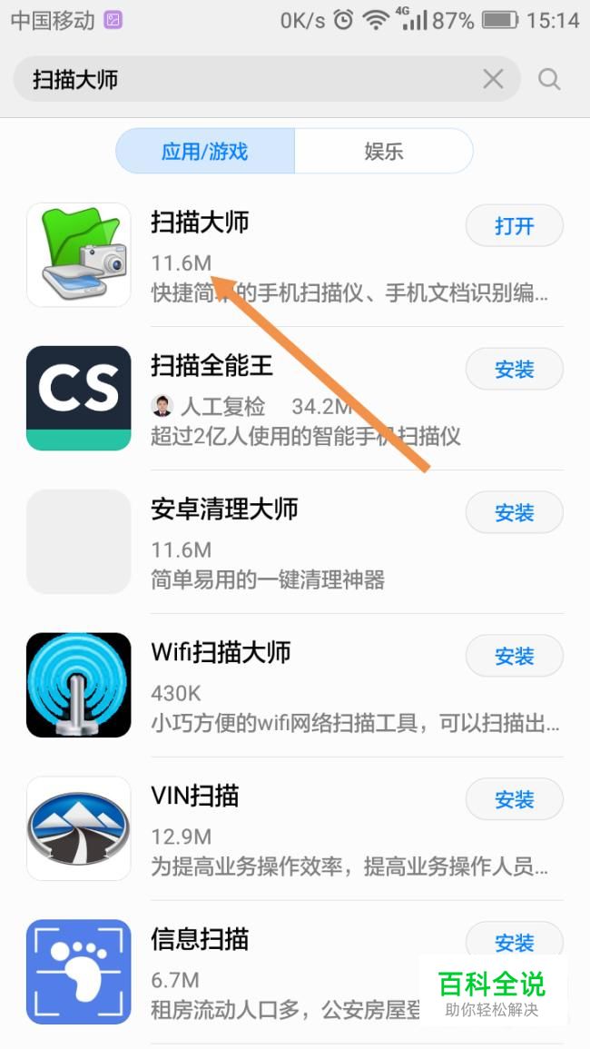 打开手机应用,搜索并安装扫描大师,如图所示。