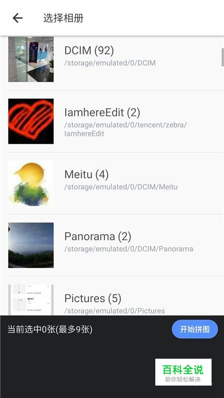 进入选择相册界面,在相册中点击9张想要进行制作的图片,点击“开始拼图”