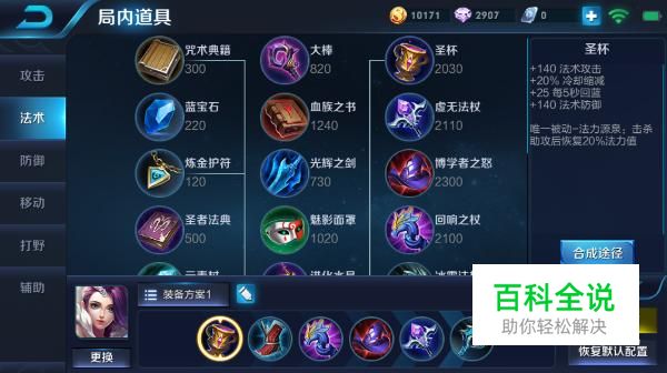 第一件神装:圣杯 甄姬的第一件神装小编推荐出圣杯,这样可以在一开始的时候就能为甄姬带来140点法术攻击、20%的冷却缩短时间、每5秒回蓝25点以及140点的法术防御。更为重要的是圣杯的唯一被动能为甄姬带来20%的法力恢复值(获得人头或助攻时触发)。