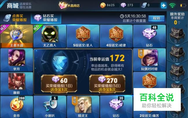 在商店——夺宝中,使用钻石抽奖。建议大家每次花费270钻石抽奖5次,这样不仅能获得奖励,还能累加5个幸运值,当幸运值满了的时候抽奖,根据规则一定可以抽到王者水晶。