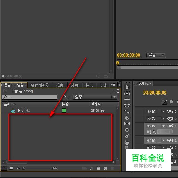 打开premiere之后,在项目面板的灰色区域,如图,也就是红色框区域双击鼠标左键,开始导入要剪裁的视频。