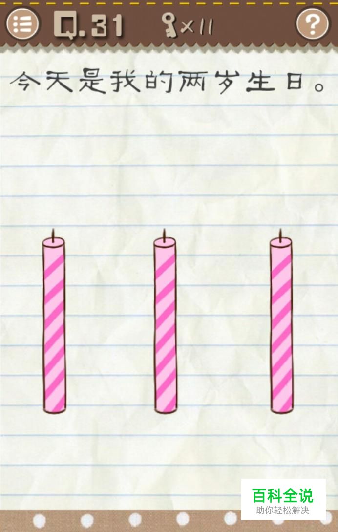 第三十一关。 两岁生日自然是点两根蜡烛啦。问题是怎么点燃呢?如果一根一根去点的话,是点不燃的。我们要用两根手指头同时按着两根蜡烛,这样两根蜡烛就会同时燃起。