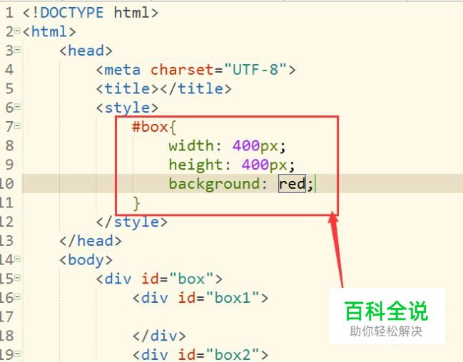 然后我们来设置box的样式,这里我就设置成宽高400像素,并且我设置它的背景颜色为红色,这样方便我们待会观察布局。
