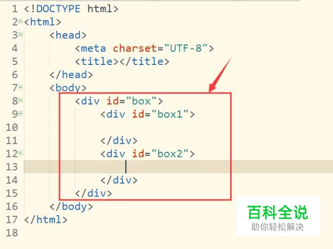首先,在一个新的HTML文件里面书写一个id为box的div,这个box作为最大的容器,并且里面存放了两个子div,分别是box1和box2。