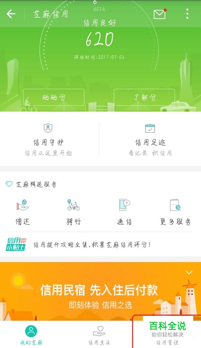 首先我们要知道提升额度必须要提升自己的芝麻信用积分,我们进入芝麻信用的界面。