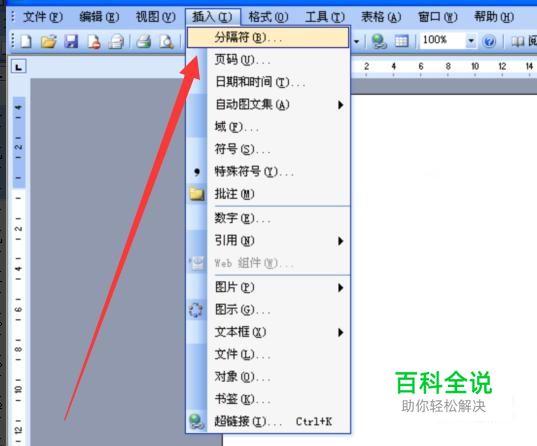 在word中的某一页插入页眉页脚,关键在于插入分隔符。为了更好的演示效果,小编特地又装了一下03版的office~